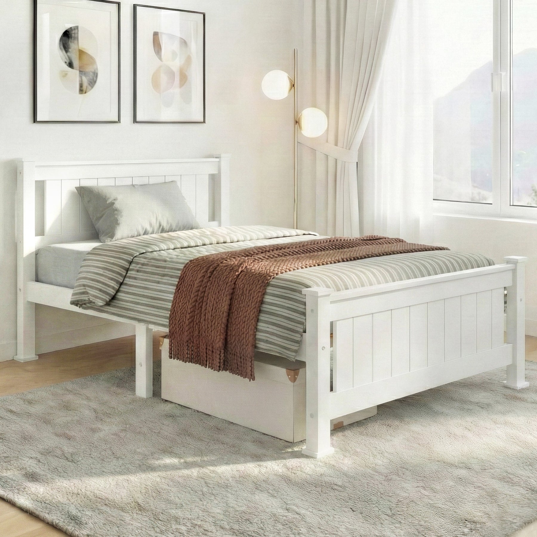 Strong and sturdy, the Bed Frame comes with a durable plywood slated base, reinforced angled brackets for long term support, stylish headboard, heavy-duty steel fixings and smooth edges all round. Finished in a non-toxic, eco-friendly white paint, the neutral-coloured Bed Frame makes for easy d??cor coordination with any bedroom. Better still, the Bed Frame also has ample space below to fit in a pair of optional trundle drawers for extra storage of bedding essentials.