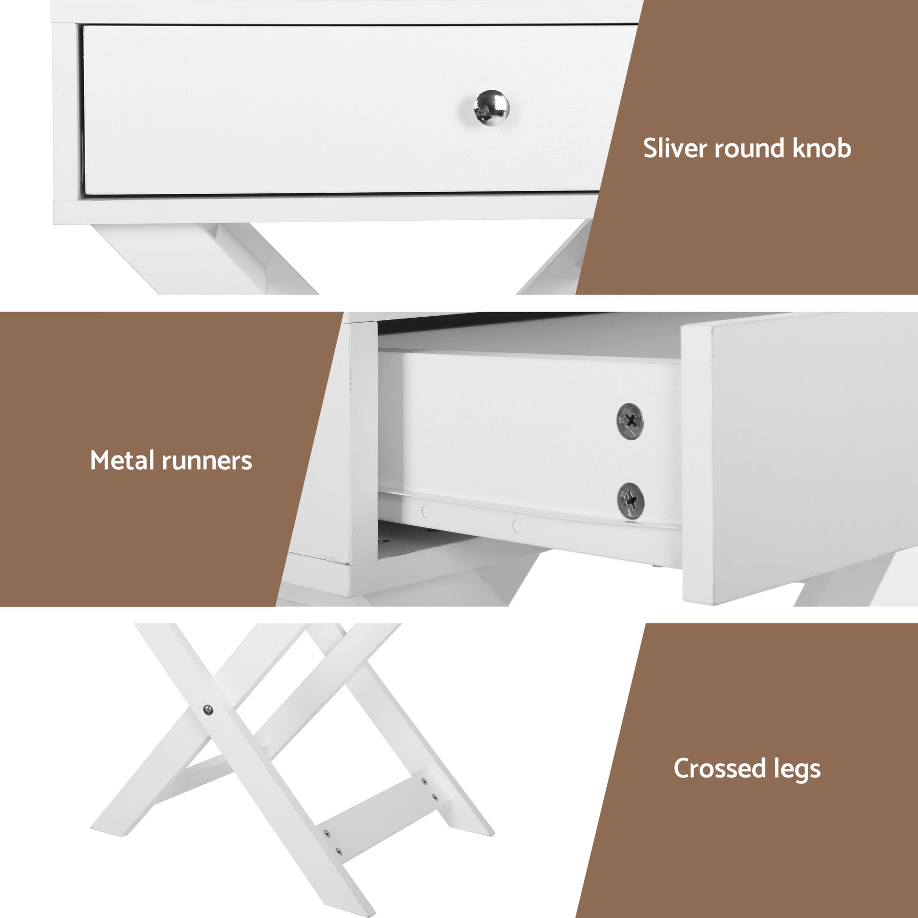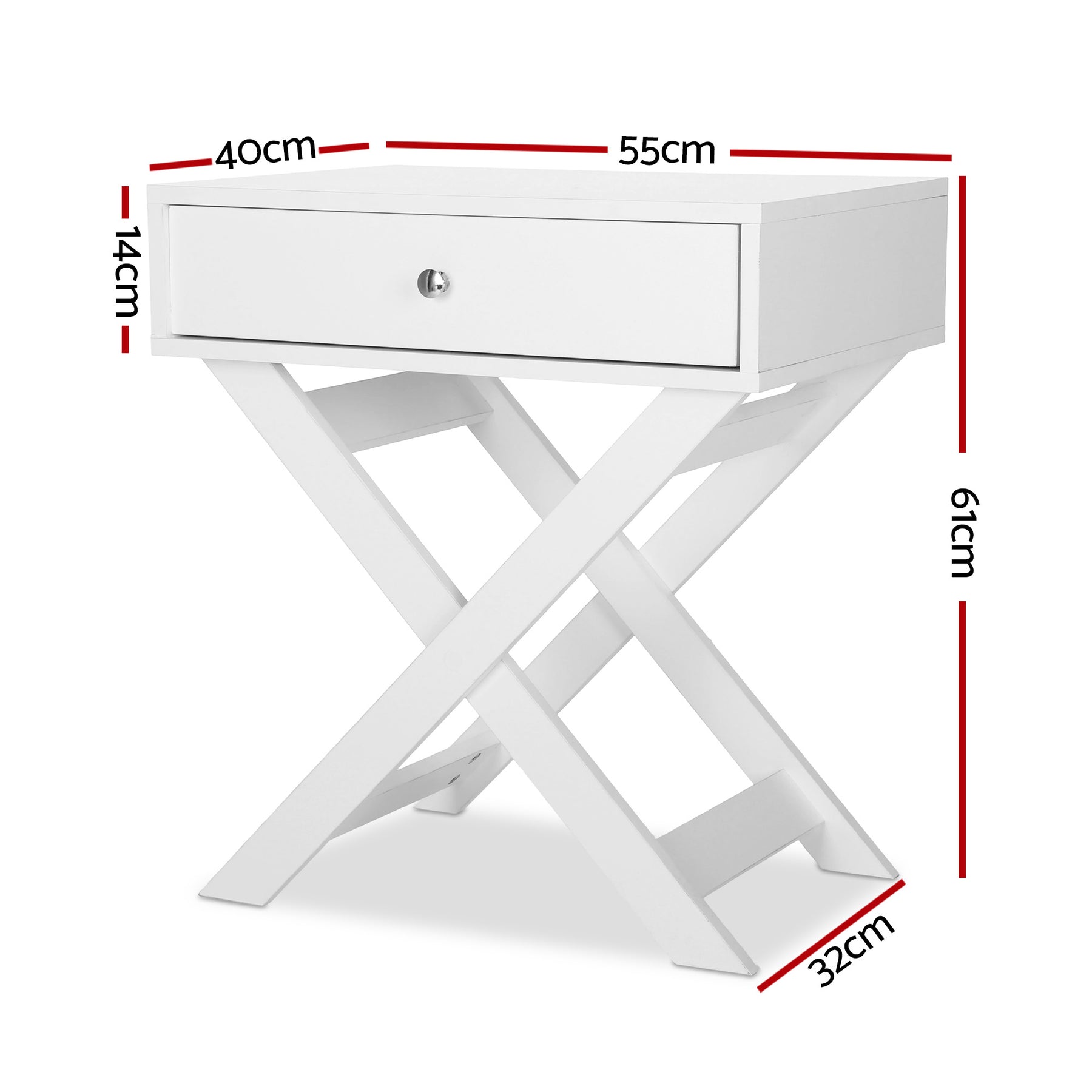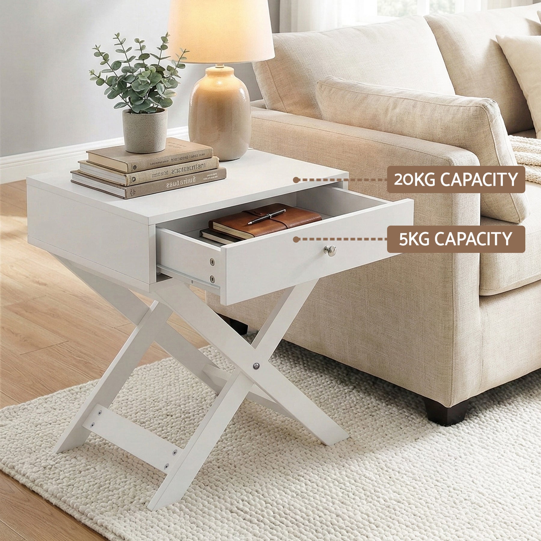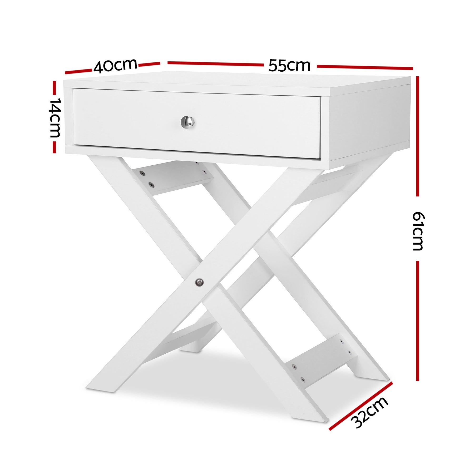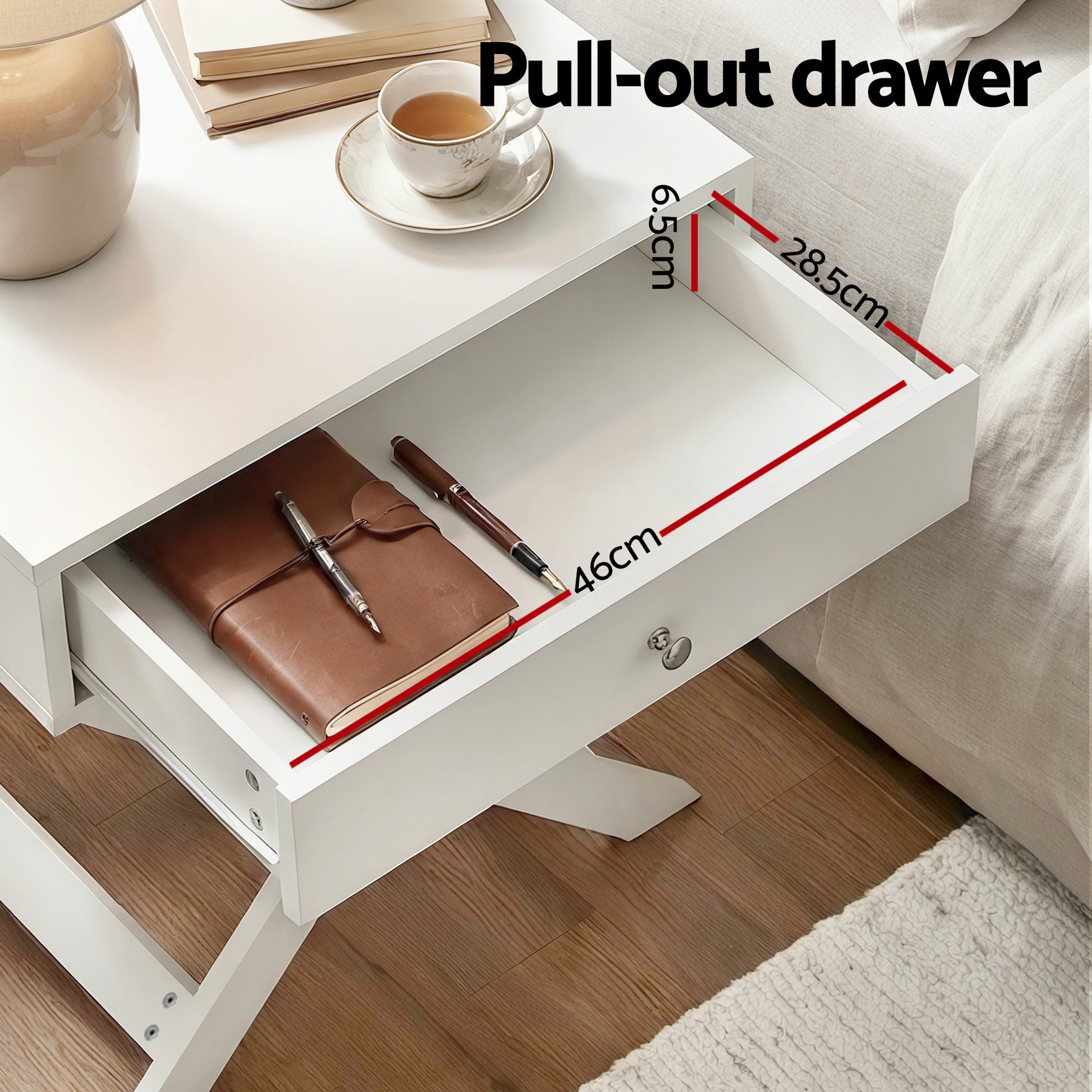 Regular price $106.99Many bedside tables look mundane and ordinary, but not our rustic retro-inspired Artiss Qara Bedside Table. Crafted from solid E1 particle board with a melamine finish, our bedside table is incredibly durable and built to last. The cross-legged design is not only uniquely stylish but provides additional support. The generous-sized storage drawer is fronted by a sleek aluminium handle and opens smoothly to ample space for your bedside essentials. The generous tabletop has a weight capacity of 20kg for your favourite books, d??cor or other trinkets. Of course, our bedside table need not be confined to your bedside. It also sits well next to your favourite armchair or at any end of your lounge set. Easy to assemble and even easier to maintain, the Artiss Qara Bedside Table is the perfect addition to any bedroom.