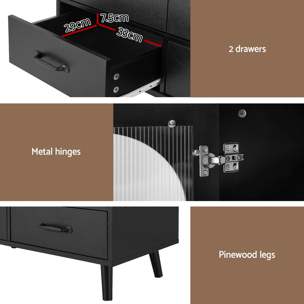 The Lency Buffet Sideboard is a stylish and functional storage solution for your modern home. With two large cabinets and two generous drawers, the cabinet offers ample storage space to keep your belongings organised and clutter-free. The fluted plastic door panels add a touch of elegance while the magnetic door fittings ensure secure closure. Solid pinewood legs keep the cabinet standing tall, and the quality metal hinges ensure durability and longevity. For additional safety, your purchase includes an anti-tip kit to secure your cabinet to the wall. Cleaning and maintenance are a breeze, making this sideboard a practical choice. Plus, it is easy to assemble, saving you time and effort. Upgrade your living space with the Artiss Lency Buffet Sideboard today.