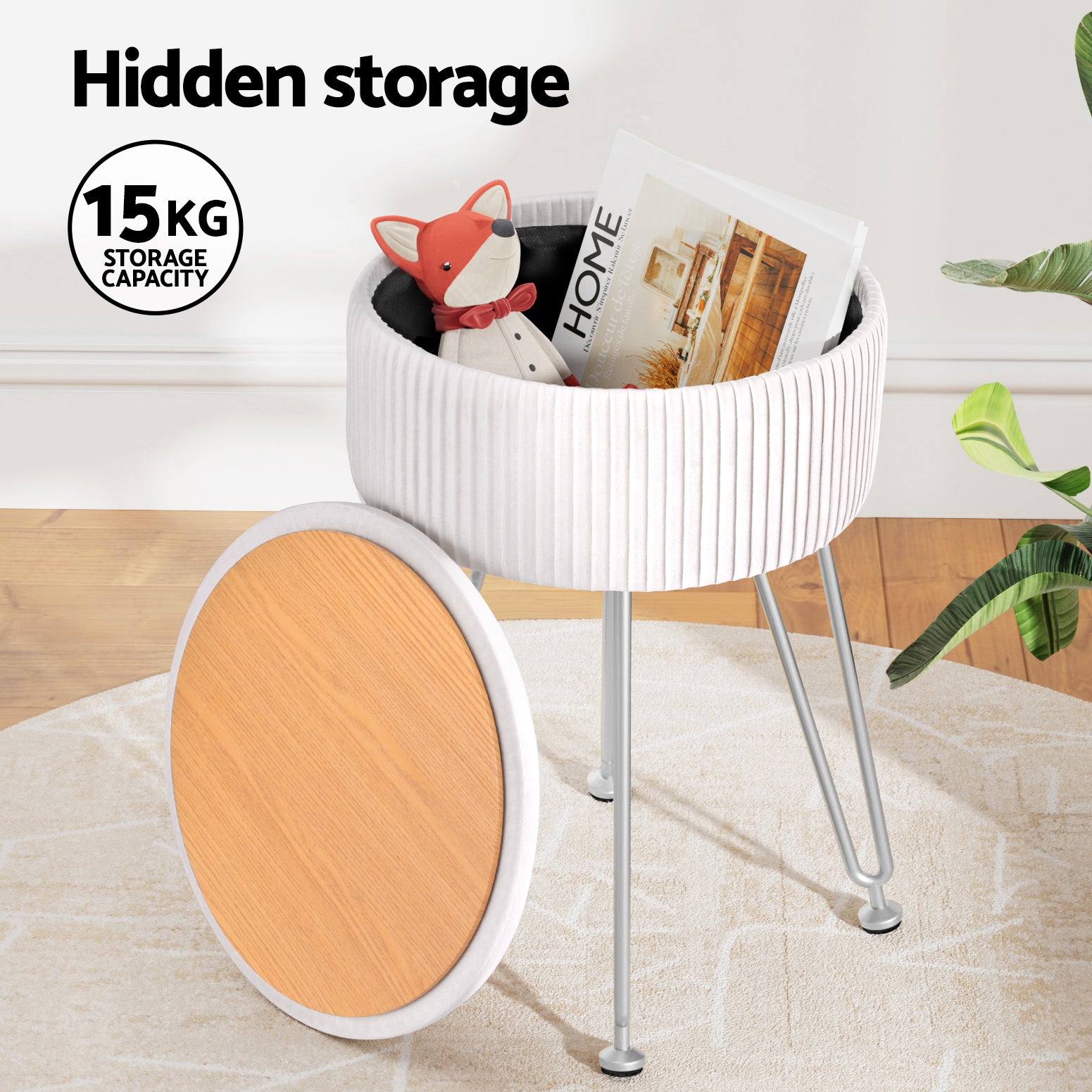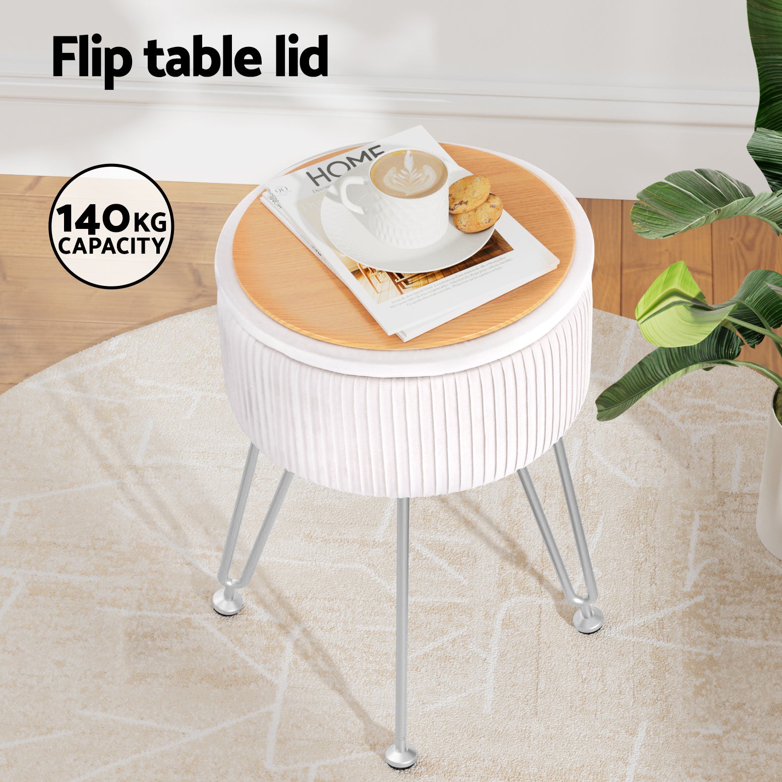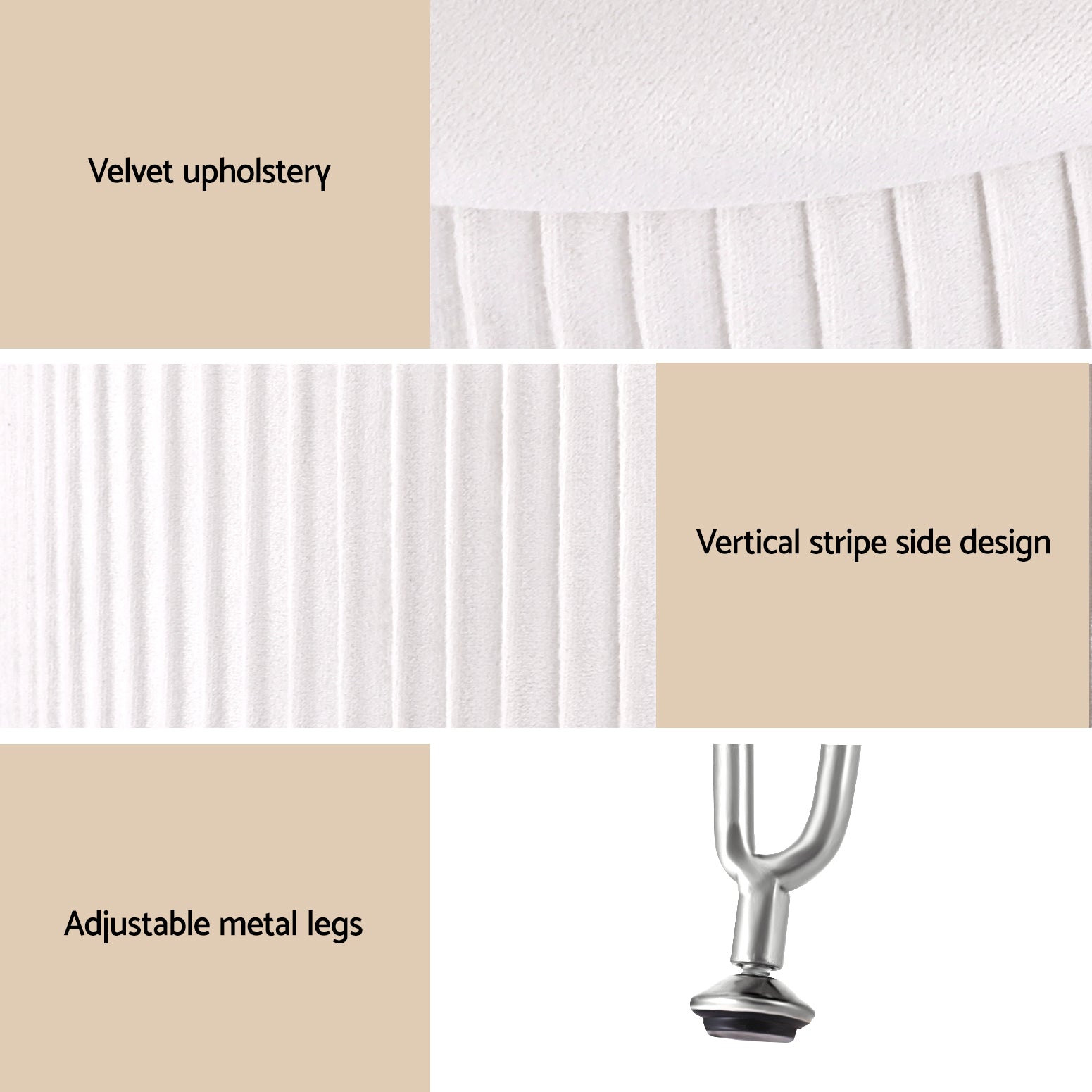 Regular price $107.99This round velvet Artiss footstool features a reversible table lid, vertical stripe design, durable MDF frame, high-resilience foam padding, and adjustable metal legs with floor protectors. Use it as a footstool, coffee table, and storage. Simple assembly required.
