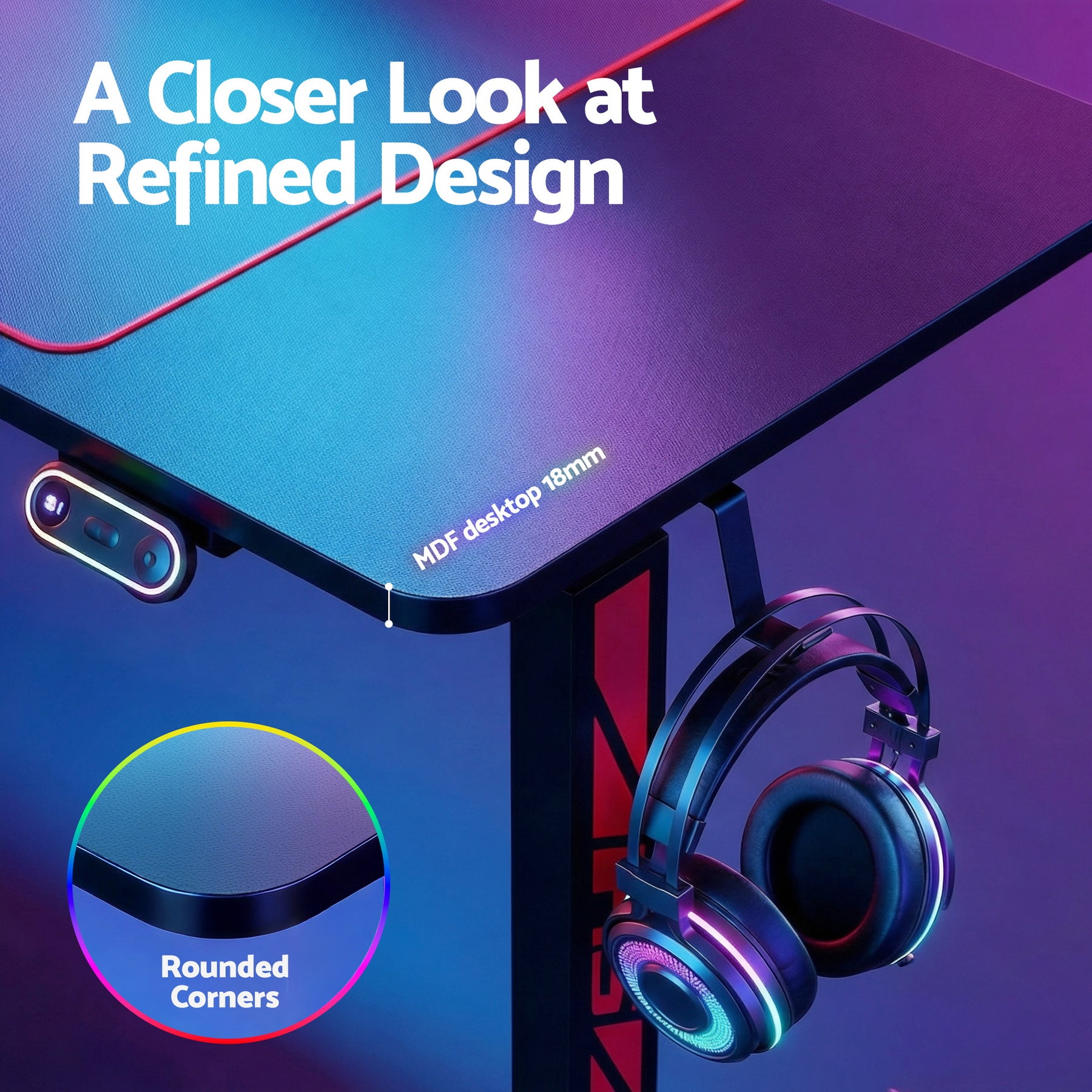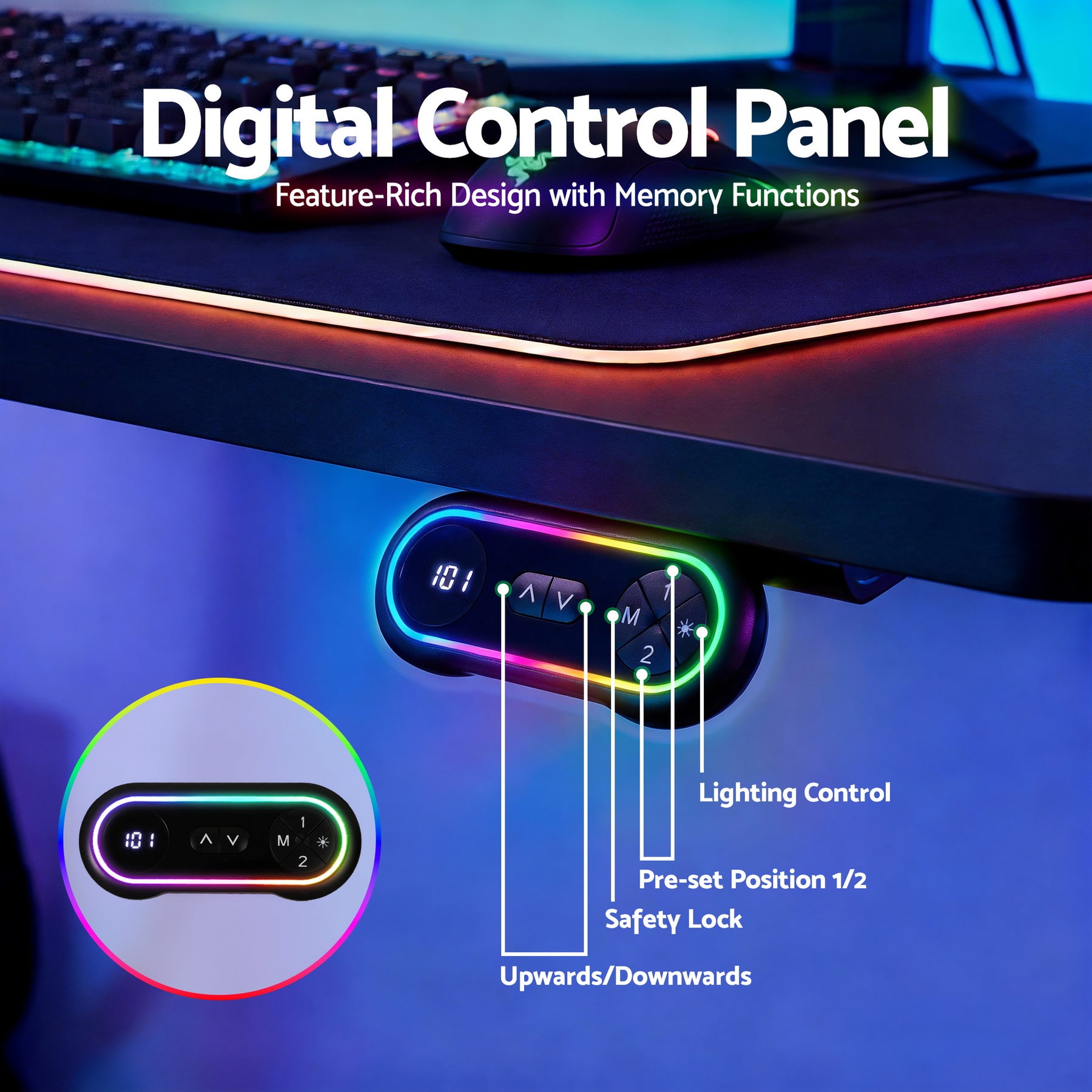 Elevate your setup with the Artiss RGB Electric Gaming Desk. Features smooth sit-stand height adjustment (73-121cm), memory presets, and dynamic LED lighting. Includes a full mouse pad, cup holder, headset hook, and USB charging. Ergonomic, durable 18mm MDF build for the ultimate battle station.